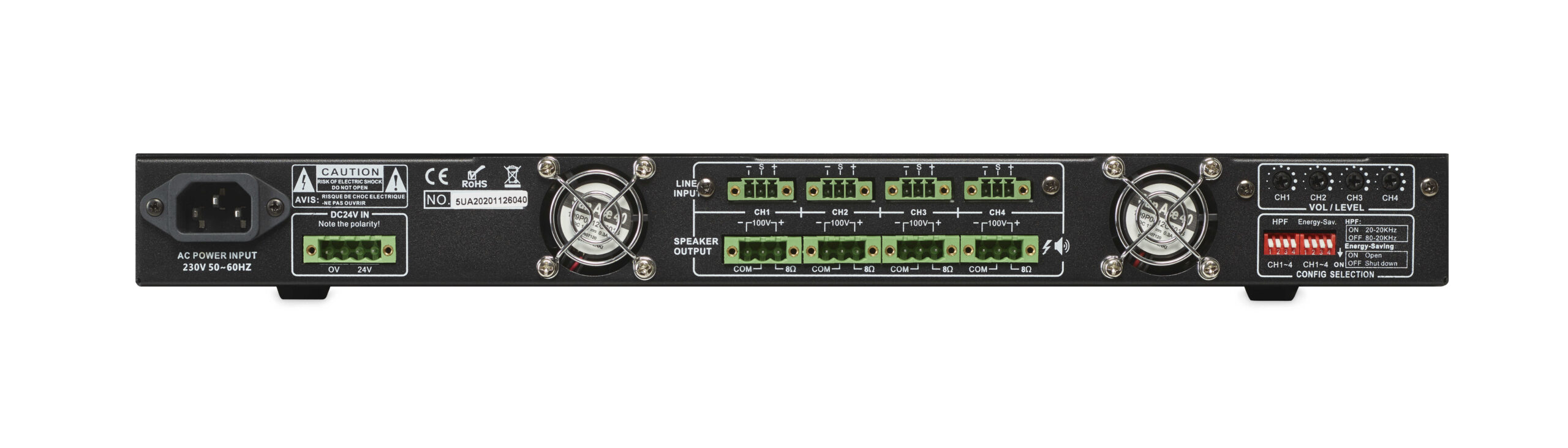 Amplificatore professionale a 4 canali da 100 V in un cabinet 1U ultracompatto da 19". Questa amplificazione di Classe D ad alta efficienza garantisce elevata potenza, bassa distorsione e minima generazione di calore. Fornisce fino a 350 W di potenza su quattro zone.